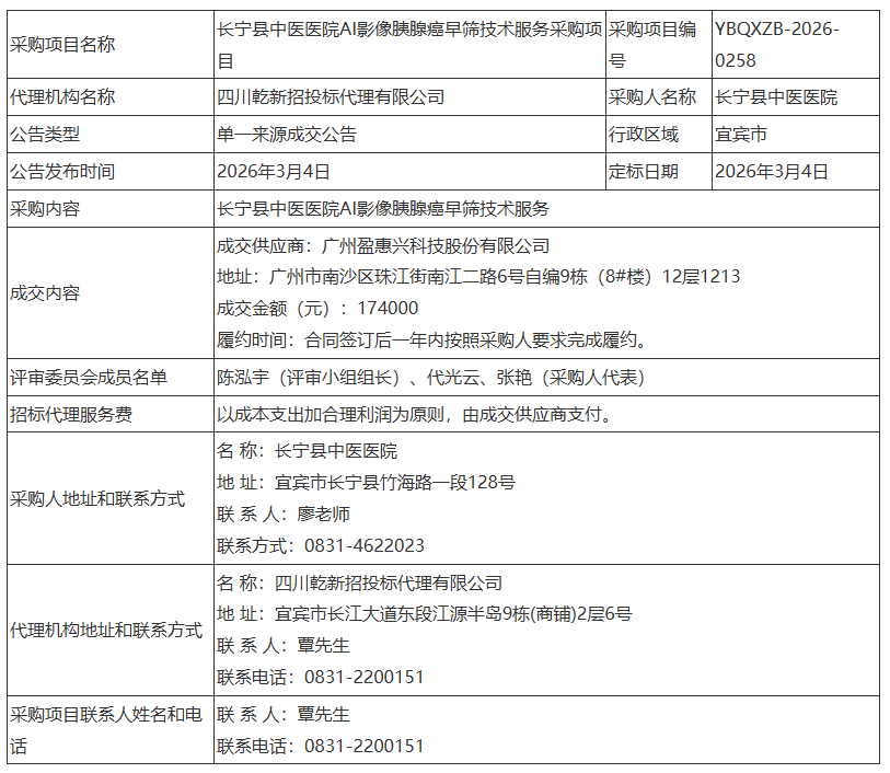长宁县中医医院AI影像胰腺癌早筛技术服务采购项目单一来源成交公告