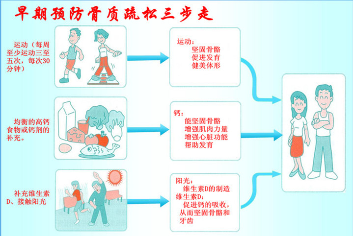 可多食富含钙的食物如:奶制品(酸奶、牛奶、奶酪、脱脂牛奶),大豆制品,鱼和贝类,绿色和黄色蔬菜、藻类等;可多摄入富含维生素D的食物:海鱼、动物肝脏、蛋黄和瘦肉中;可多摄入富含维生素K的食物:如绿色蔬菜、纳豆、海藻、茶叶等。