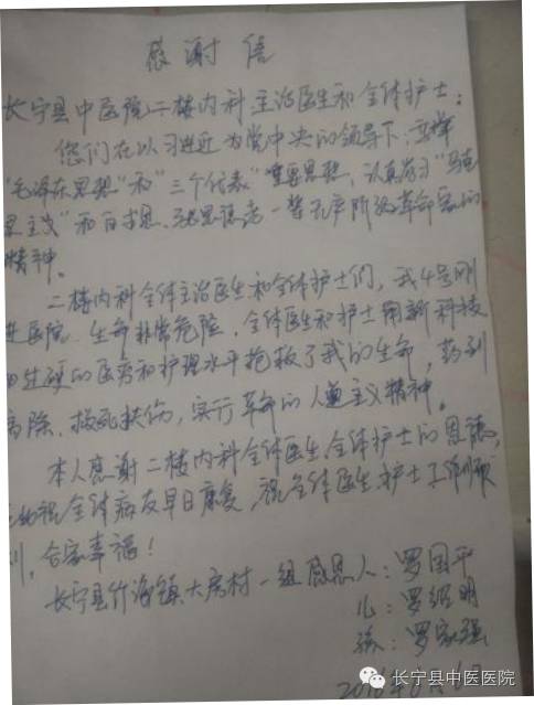 这封暖暖的感谢信虽然简短,却是对科室全体医护人员的鼓励,是对医护人员繁忙工作的肯定,折射的是医患之间的相互信任与和谐的医患关系,同时也是对我院每一位医护人员的鞭策,提醒我们踏实做好工作,用精湛娴熟的医疗技术为每一位患者服好务!